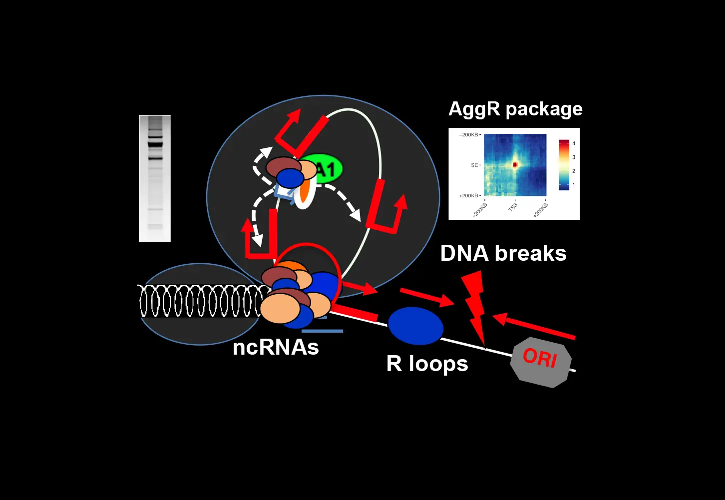 En outre, nous pouvons maintenant aborder systématiquement la manière dont les contacts transitoires à longue portée peuvent entraver la dérégulation fortuite des gènes au-delà des frontières des TAD ou à travers les isolateurs en utilisant et en intégrant les données de nos approches omiques, microscopiques et CRISPR à l’échelle de la cellule unique. Notamment, les contacts transitoires enhancer-promoteur sont sous l’influence de facteurs tels que le cohesin qui peut médier l’extrusion des boucles, les isolateurs et les ARN non codants. L’accumulation d’ARNnc par plusieurs moyens, y compris la déplétion de l’ARN hélicase, peut entraver la formation de boucles 3D en régulant l’attachement ou la stabilité des protéines insulatrices et des cofacteurs contenant un domaine de liaison à l’ARN. Grâce à un grand nombre de données préliminaires, nous étudions ces mécanismes en combinant des approches d’ingénierie génomique CRIPR/dCas9 et des approches computationnelles. Nous analysons comment l’accumulation d’ARNnc régule la dynamique des insulateurs et des cofacteurs et les contacts à longue distance associés entre l’enhancer et les promoteurs cibles distants, établissant un lien entre les régulations structurelles et fonctionnelles.