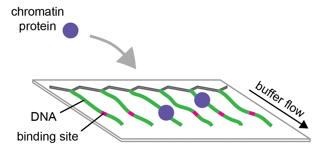 Nous utilisons des techniques de molécule unique notamment les « DNA curtains » pour étudier le comportement dynamique des molécules d’ADN et de leurs partenaires d’interaction en temps réel. Les « DNA curtains » nous permettent de visualiser et quantifier directement la liaison des protéines à l’ADN et le transport des protéines le long de l’ADN. Nous pouvons également suivre les changements de conformation de l’ADN et les mécanismes de l’assemblage de complexes nucleoprotéiques. Sur la base de ces données, nous cherchons à comprendre comment différentes protéines déterminent la répartition du génome en types de chromatine fonctionnellement distincts et sa perturbation en cas de maladie.