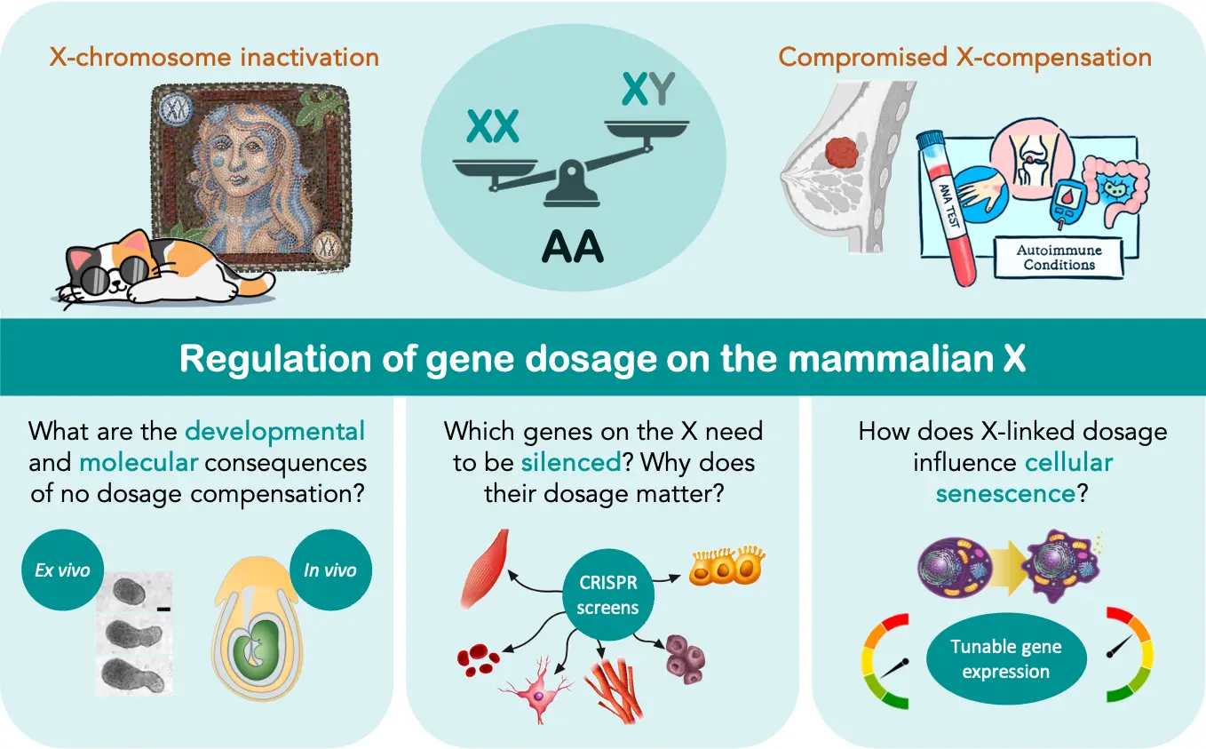 L’objectif de l’équipe est de décrypter les mécanismes moléculaires qui aident les cellules à « faire des maths » pendant le développement – après tout, les cellules sont capables d’interpréter des informations numériques, comme le nombre de chromosomes dans leur noyau ou les gradients de morphogènes dans l’espace extracellulaire, et ensuite de « prendre » des décisions basées sur ces informations, comme le choix du type de cellule à devenir. L’équipe s’intéresse en particulier à la manière dont les cellules perçoivent et interprètent le dosage différentiel des gènes, c’est-à-dire le nombre de copies d’un gène dans le génome. On étudie le chromosome X des mammifères, qui est le plus souvent présent en un ou deux exemplaires dans le noyau, dans les cellules XY ou XX, respectivement. Cette différence a eu des implications importantes au cours de l’évolution des mammifères, notamment l’émergence d’un mécanisme de compensation de dose – l’inactivation du chromosome X – chez les individus XX. Comme modèles, nous utilisons des cellules souches embryonnaires et des embryons de souris, en tenant compte des considérations éthiques qui y sont associées, ainsi que des lignées cellulaires humaines.