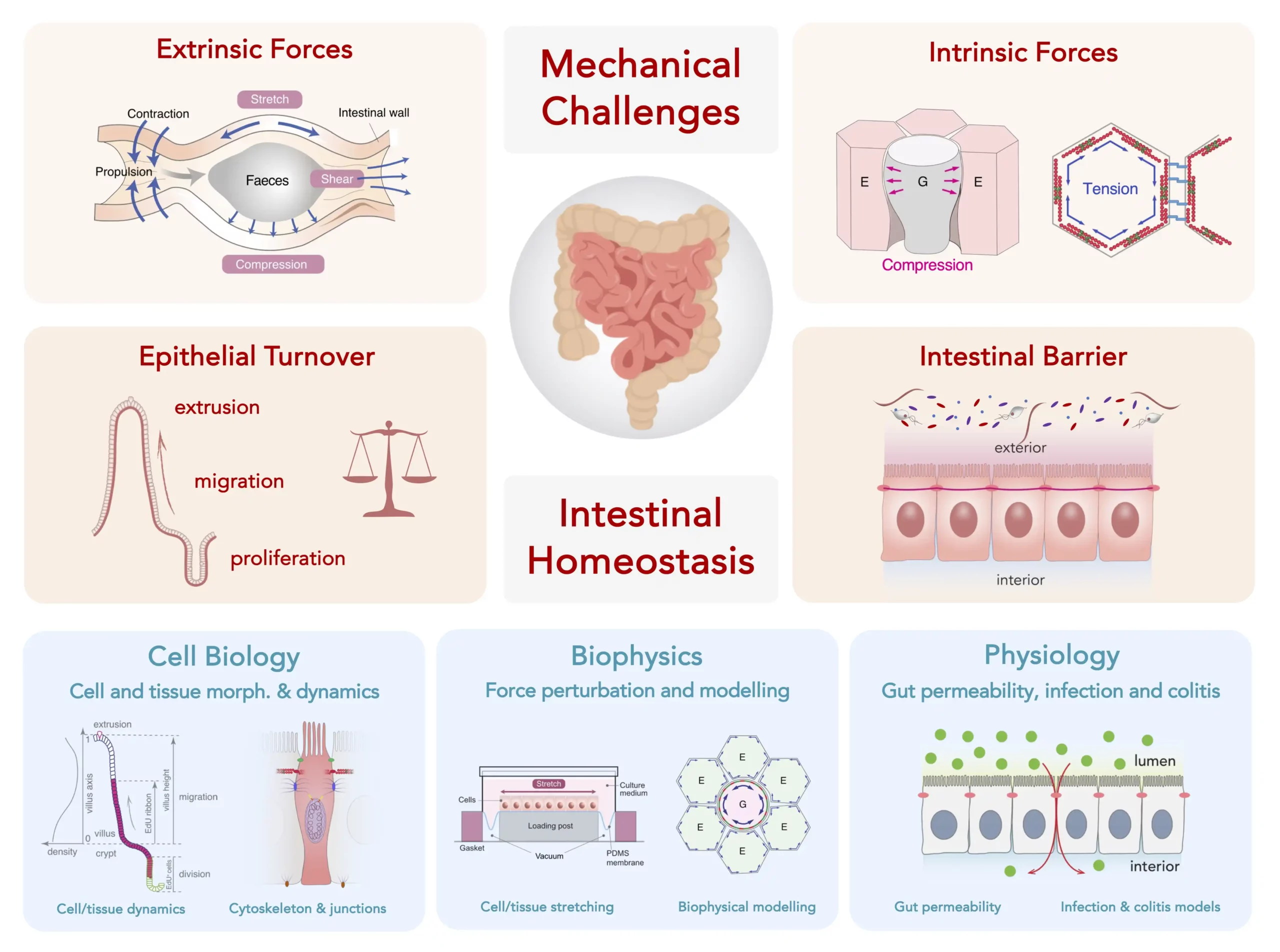 Notre groupe de recherche cherche à élucider les principes biophysiques qui régissent le renouvellement des tissus épithéliaux et leur intégrité dans l’intestin des mammifères, en intégrant les mécanismes à l’échelle cellulaire et tissulaire dans ce contexte physiologique. Pour ce faire, nous utilisons une gamme de modèles expérimentaux, notamment des souris transgéniques, des explants tissulaires, des organoïdes et des systèmes microphysiologiques. Nos approches interdisciplinaires incluent l’imagerie des tissus vivants, des interventions génétiques et pharmacologiques, des manipulations de forces et la modélisation théorique.