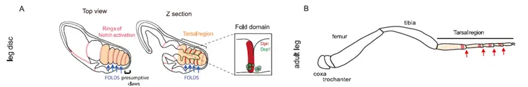 Nous avons ensuite cherché à comprendre comment la mécanique tissulaire contrôle la robustesse morphogénétique face au bruit développemental. En utilisant la patte en développement de la drosophile et ses plis tarsiens stéréotypés comme modèle, nous montrons qu’un biais dans la propagation des forces assure une morphogenèse stéréotypée malgré la présence de bruit mécanique dans l’environnement. Nous avons constaté que l’inactivation d’Arpc5, membre du complexe Arp2/3, affecte spécifiquement la directionnalité des plis sans altérer les schémas développemental et de génération de force (voir vidéo 5). En combinant modélisation in silico, outils biophysiques et outils génétiques ad hoc, nos données révèlent que la polarité planaire de la myosine II jonctionnelle favorise la canalisation des forces à longue portée et assure la robustesse du repliement, évitant la diffusion des forces et isolant ainsi le domaine de repliement des perturbations mécaniques environnantes