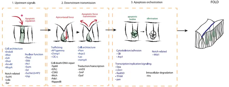 Schéma résumant les différents types de candidats identifiés par criblage génétique, notamment : (1) de nouveaux régulateurs potentiels de l’apoptose endogène ; (2) des gènes potentiellement impliqués dans la transmission en aval du signal apoptotique ; et (3) des gènes impliqués dans l’orchestration de l’apoptose conduisant à la formation des replis.