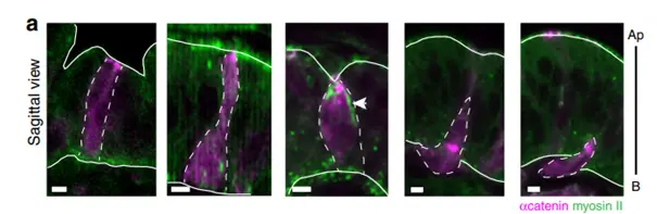 Images de cellules subissant une EMT (induite par l’expression de Snail) à différents stades du processus d’extrusion. Les cellules EMT sont en magenta (a-Cat), la myosine II non musculaire est en vert. Notez la présence d’une structure transitoire apico-basale dans l’image centrale qui coïncide avec une déformation apicale de l’épithélium.