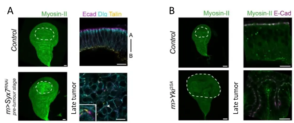 La myosine II s’accumule spécifiquement dans les tissus prétumoraux des tumeurs agressives. A. Tissu prétumoral ARNi Syx7 présentant une accumulation de myosine II par rapport au témoin (à gauche), tandis que les tissus ARNi Syx7 évoluent vers des tumeurs dysplasiques (à droite). B. Tissu prétumoral Yki3SA ne présentant aucun signe d’accumulation de myosine II (à gauche), tandis que les tissus Yki3SA évoluent vers des tumeurs hyperplasiques.