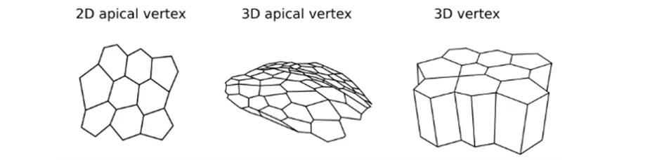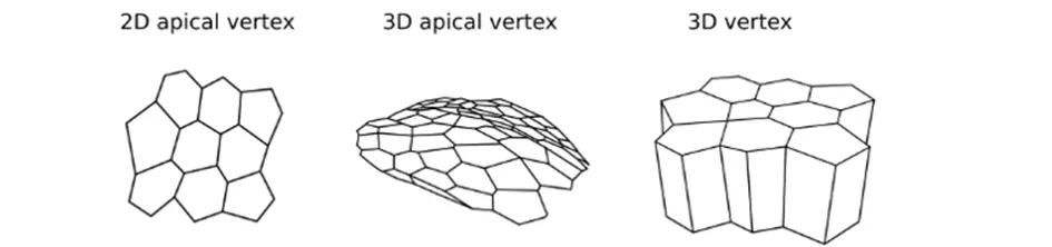 Figure représentant les différents types de maillage : sommet apical 2D (à gauche), sommet apical 3D (au milieu) et sommet 3D (à droite).