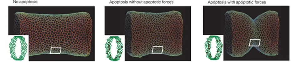 Simulations montrant la forme d’un épithélium virtuel cylindrique avec (au milieu et à droite) et sans (à gauche) l’extrusion d’une trentaine de cellules apoptotiques, et avec (à droite) et sans (au milieu) forces centripètes apoptotiques.