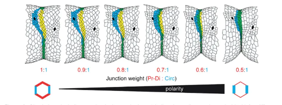 Nous nous sommes ensuite demandé si la restauration de la polarité de la myosine II dans un tissu non polarisé pouvait corriger les défauts de déviation de pli. Bien que cela ne soit pas réalisable in vivo, nous pourrions aborder cette question par modélisation in silico, en nous demandant si la déviation de pli causée par des perturbations mécaniques locales pouvait être corrigée par l’introduction de myosine II jonctionnelle polarisée planaire. Afin d’intégrer la polarité planaire de la myosine II dans le modèle, nous avons reproduit la polarité planaire de la myosine II et l’anisotropie de tension associée en attribuant différentes valeurs de tension jonctionnelle selon l’orientation de la jonction dans notre modèle. La robustesse du pli n’a pas été affectée par l’intégration de la polarité de tension dans le modèle en l’absence de perturbations externes. Il est intéressant de noter que l’augmentation progressive de la polarité tissulaire favorise la rectitude du pli et son insensibilité aux perturbations environnantes. Nous avons également quantifié la robustesse morphogénétique du pli dans notre modèle théorique pour différents degrés de polarité. Il est intéressant de noter que l’augmentation de la polarité diminue le degré de déviation du pli et donc la variabilité de sa directionnalité, ce qui confirme que la polarisation planaire de la tension tissulaire favorise l’isolation mécanique de la formation du pli, ce qui garantit in fine la robustesse morphogénétique.