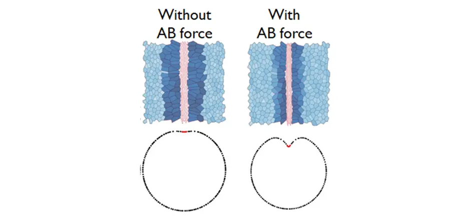 Simulation de l’invagination du mésoderme en absence (à gauche) ou en présence (à droite) de force apico-basale.