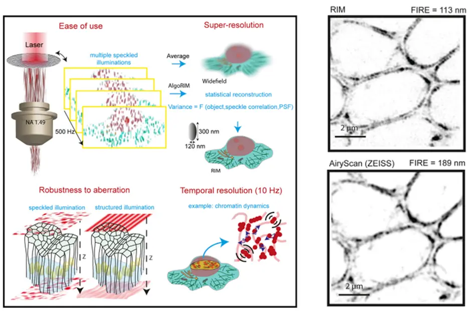 Les méthodes actuelles de microscopie à super-résolution (SRM) souffrent d’une complexité intrinsèque qui pourrait limiter leur utilisation courante en biologie cellulaire. Nous contribuons au développement d’une nouvelle méthode basée sur la microscopie à illumination aléatoire (RIM), développée par Thomas Mangeat au CBI, qui augmente la résolution de l’imagerie en temps réel en x, y et z, évite les aberrations optiques tissulaires en profondeur et est compatible avec l’imagerie multicolore de cellules vivantes sur de longues périodes.